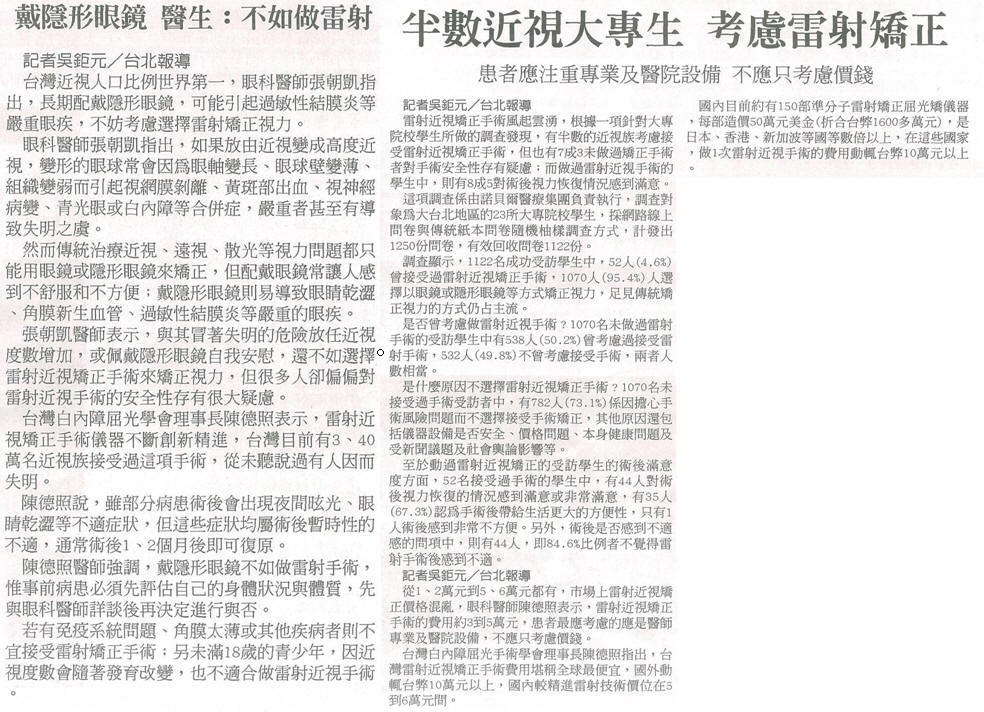 94-12-27戴隱形眼鏡 醫師:不如做雷射 半數近視大專生 考慮雷射矯正