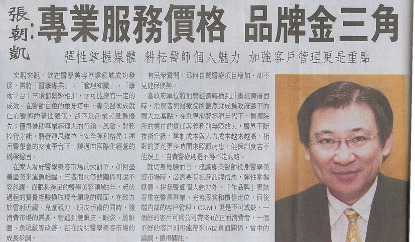 就切身經驗而言,建議專業醫師投身醫學美容市場時,必需要有經營品牌信念,彈性掌握媒體、耕耘醫師個人魅力外,「作品牌」更該著重在醫療專業、完善服務和價格定位,而後端內部的客戶管理(CRM)更是不可或缺,一個好的客戶可為公司帶來4位正面消費者,一個不好的客戶則可能帶來16位負面關係,當中的論調,值得關注。