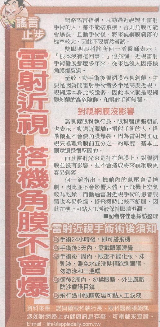 雷射近視搭機角膜不會爆 2006-08-05 蘋果日報 謠言止步