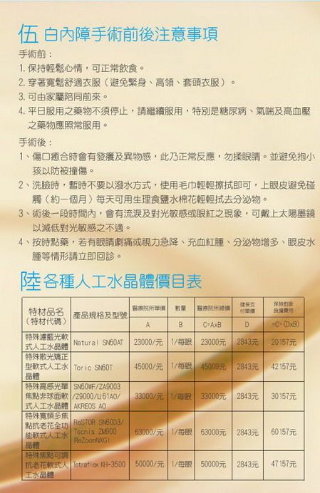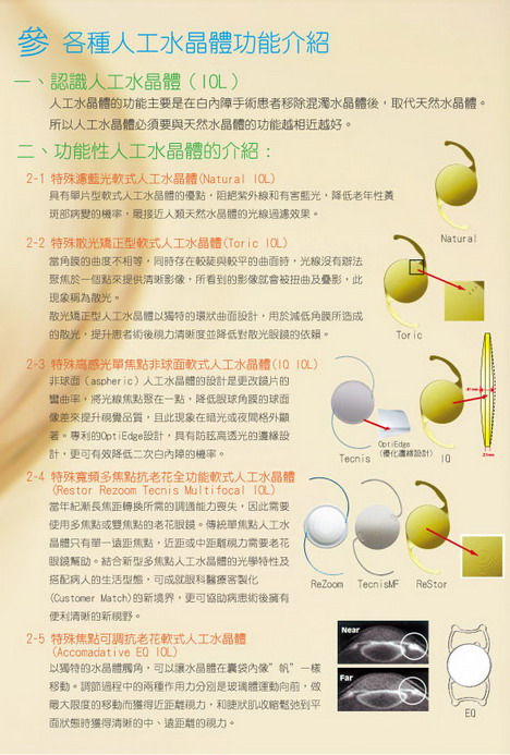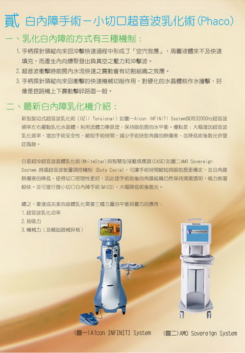 (一) 前言 白內障是因水晶體混濁,導致視力障礙的一種疾病,通常可分為先天性與後天性兩種,其中又以後天性的老年性白內障為最常見。老年性白內障是一種老化的現象,隨著年齡的增加,水晶體會慢慢發生硬化、混濁的情形,據統計資料顯示,國人白內障罹患率,五十歲以上有60%,六十歲以上有80%,七十歲以上則高達90%以上,所以老年性白內障可說是老年人很普遍的疾病。一般來說,白內障的治療仍以手術為主,藥物治療通常沒有什麼療效,隨著醫學的進步,眼科手術已進入顯微手術的時代,人工水晶體的發展更使白內障手術後視力矯正臻於完美。 (二) 白內障的症狀及成因 1.簡單地說,白內障就是原來透明的水晶有混濁的現象。水晶位於虹膜與玻璃體之間。白內障早期的症狀可能有視力模糊、色調改變、怕光、眼前黑點、複視、晶體性近視等,晚期症狀則為視力障礙日深,最後只能在眼前辨別手指或僅剩下光覺視力。 2.白內障可能的原因如下: (1)老年性白內障:為最常見的一種白內障,隨著年齡的增加,四、五十歲後,水晶體會慢慢發生硬化、混濁而漸造成視力的障礙。 (2)外傷性白內障:車禍、鈍器傷害、尖銳物品的刺傷或穿透性眼內藥物所引起 (3)併發性白內障:因虹彩炎、青光眼、網膜色素病彎等等引起的白內障。 (4)代謝性白內障:如糖尿病、甲狀腺疾病等引起之白內障。 (5)藥物性白內障:因長期使用類固醇等藥物所引起之白內障。 (6)先天性白內障:由於遺傳性、染色體變異、胎內感染等所引起,嬰兒瞳孔內可見白色或灰色的混濁點,視力發展差。 (三)白內障的治療 1.藥物治療: 市面上有許多號稱可溶解或使白內障停頓下來的眼藥水,但其實際效果仍未確定。 2.白內障的手術療法: 手術治療為白內障唯一直接有效的治療方法。手術時間約15~20分鐘,不需住院。本院採用最新的超音波乳化術機器,將水晶體震碎及乳化後吸出,再置入軟式人工水晶體,傷口小,不需縫合。復原快,手術成功率在九成以上,術後只需在門診追蹤治療即可。 3.接受白內障手術的適當時機: 依個人的生活需要而定,即視力障礙已經影響到日常工作與生活習慣,就可以開刀了。有些過度成熟的白內障,會引起晶體性青光眼,故不宜等到白內障過熟時而手術,以免發生合併症。 (四)有關白內障手術前、後的問題 1.手術前應作什麼檢查? 手術前應作眼部一般檢查及人工水晶體度度數之計算。 2.糖尿病或高血壓患者可以動手術嗎? 糖尿病或高血壓患者需將血糖、血壓控制穩定後才可以開刀。 3.手術後應注意什麼? (1)手術後一至兩個月內應避免提重物及激烈運動,刺激性的食物或酒也應避免。 (2)手術後早期應每星期回診一次,若有紅腫、疼痛、視力減退等現象,須馬上回診。 4.白內障手術後還會再生嗎? 目前白內障手術均保留原來之後囊,以便置入人工水晶體,此後囊幾個月或幾年後可能再度變厚而使視力模糊,叫做後發性白內障。此時可使「用雅各雷射」照射即可破壞此膜,恢復視力,不需再度開刀。 5.白內障手術有沒有併發症? 任何眼部的手術都可能會產生併發症,一般眼內手術併發感染機會約千分之一,必須立即治療。其他併發症,如眼壓持昇高,葡萄膜炎、黃斑部水腫或視網膜剝離等,但很罕見。 (五)白內障手術的發展 所謂的白內障手術就是要從水晶體囊袋中移除霧化的水晶體後,植入人工水晶體。傳統的手術方式稱為「囊外白內障摘除術(ECCE)」,需要利用較大的傷口來移除水晶體,所以必須縫合傷口。 目前最廣泛使用的手術方式為「超音波晶體乳化術(Phaco)」,利用這種手術並配合植入可摺疊式人工水晶體,只需要一個非常小的切口(約3 mm)即可。所以這種手術方式也被稱為「小切口白內障手術」。 「小切口白內障手術」的主要優點就是術後傷口大多數可以完全不用縫合,或是只縫一針即可。 (六)小切口白內障手術 利用「超音波晶體乳化」的手術方式,可以透過極小的切口來移除霧化的水晶體,這種手術方式是非常安全的,全球每年約施行幾百萬個病例。這種手術方式可以使病人的不適感降到最低,而且對病人有許多優點,如:術後傷口快速癒合,減低術後併發症的發生率,並能讓病人儘早恢復日常活動。 執行超音波晶體乳術時,首先在眼睛表面做一個極小的切口,讓超音波探針進入眼內,並在水晶體前囊處開一個洞。接著將此小探針伸入水晶體中,利用超音波共振,將水晶體變成數個小片段後,利用吸除的方式將碎片吸出眼睛。最後植入人工水晶體來取代原有的水晶體。搭配可摺疊式人工水晶體可以透過較小的切口被植入,不需要再次擴大切口。 在醫院或是一般擁有手術房的診所中均可施行白內障手術。手術時只做局部麻醉,有時會給予一些鎮靜劑,讓病患在手術過程中保持鎮靜與放鬆,所以病患通常可於手術後立即返家休息,無須住院。