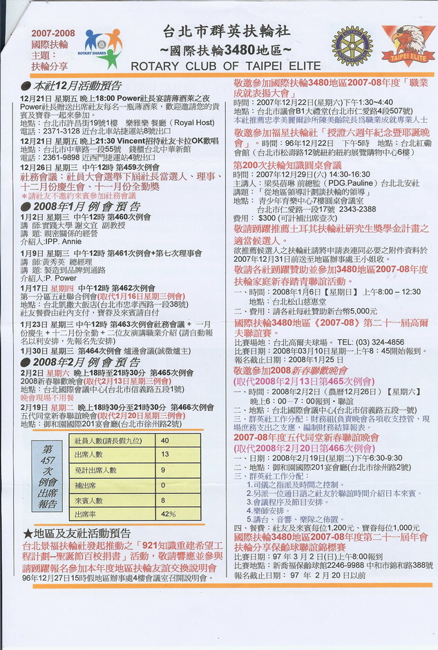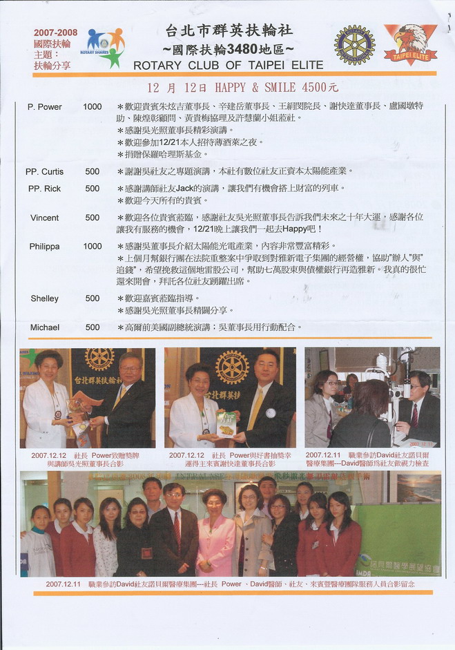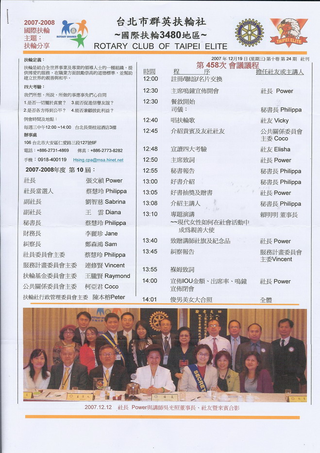 | 第457次例會通知 親愛的群英扶輪社友: 一、本社第457次例會,時間訂於12月12日(星期三)。本次例會後14︰10分舉行第十屆第六次理事會,請各位理事準時參加。(Power、Annie、Philippa、Rick、Curtis、Coco、Maggie、Miki、Tim、Dean、Vincent) 二、邀請 美聯國際集團 吳光照 董事長 專題演講。 三、講題:太陽能產業的發展。 四、說明:歡迎邀請您的貴賓及寶眷一起來參加。 五、招募社員競賽實施期間由96/10-12月中,每位社員每月可由社免費招待1位來賓之餐費。 六、敬請著正式服裝及配戴扶輪徽章。男社員著西裝打領帶,女社員著套裝或小禮服。 時 間:12月12日(三) 中午12:00註冊聯誼 /交換名片 12:30鳴鐘開始 (務必準時出席!!) 自12:30~14:00止行動電話請關靜音。 地 點:台北長榮桂冠酒店-3樓 牡丹廳 台北市松江路63號 電 話: 02-2518-8399 PS:若邀請貴賓及寶眷前來參加,請提前告知幹事珮玟,以利餐點及座位的安排!! 謝謝~~ 七、職業參訪活動預告:96年12月11日(星期二)早上10:30參訪David社友諾貝爾醫療集團,談眼科醫學新知(7樓簡報室),並做視力檢查 (5樓診療室)。請參訪之社友及寶眷帶健保卡。 諾貝爾醫療集團地址:台北市公園路13號7樓(簡報室)、5樓(診療室) 聯絡電話(02)6630-2226。 台北市群英扶輪社 社長 張文禎 P. Power敬邀 中華民國九十六年十二月六日 台北市群英扶輪社 辦事處:106台北市大安區仁愛路三段127號6樓 聯絡電話:02-2731-4869 0918-400-119 傳真電話:02-2773-8282