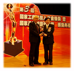 | 2004年1月15日,得獎人張朝凱 醫師(右) 於「 國家工商科技人才金像獎」暨「國家 品質保證金像獎」頒獎典禮中,從頒獎人 考試院院長姚嘉文(左)手中接受奨座。 |
