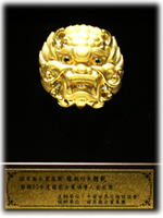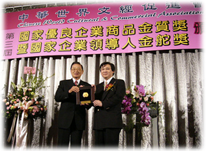 | 2004年3月4日,張朝凱 醫師(右)於「 國家優良企業商品金質獎」暨「國家企業領導人金舵獎」頒獎典禮中,從立法院副院長江丙坤手中接受奨座。 | |