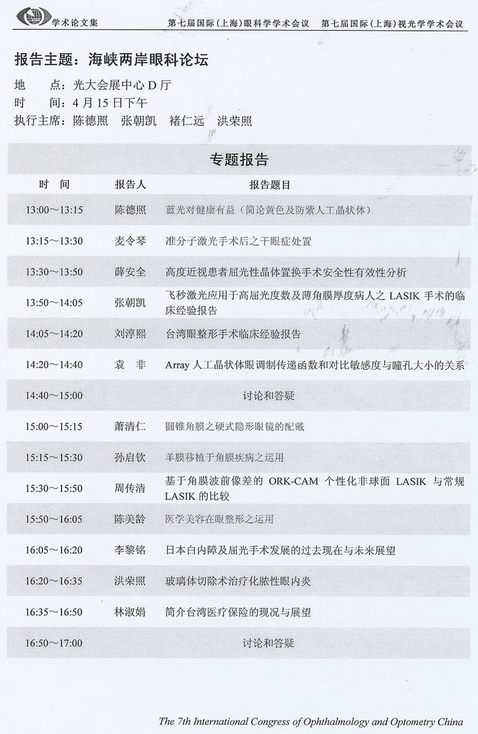 2007年4月中旬中國上海第七屆國際眼科視光學術會議(COOC)第二屆海峽兩岸眼科論壇