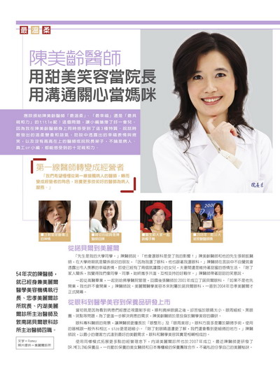 當初就是因為看到病患們經歷近視雷射手術,順利摘掉眼鏡之後,卻苦惱於眼睛太小、眼周細紋、黑眼圈、斑點等問題,為了更進一步解決病患的需求,陳美齡醫師於是投身於醫學美容的鑽研。