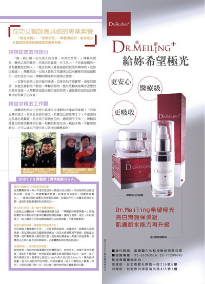 在使用同樣模式,拓展更多點的經營理念之下,內湖美麗爾診所也於2007年成立。「我們希望慢慢從第一線接觸病人的醫師,轉而變成經營者的角色,培養更多技術好的醫師,為病人服務。」2008年,陳醫師更研發了DR.MEILING保養品,一向勤於保養的美女醫師,和日本專櫃級的保養團隊合作,不藏私的分享了自己的美麗秘訣。