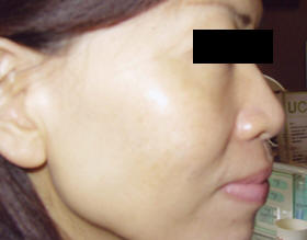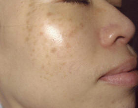 (4)去除淺層斑點、同時改善部份真皮層斑點。臉上表淺色素斑──曬斑、雀斑、老人斑之改善非常明顯。