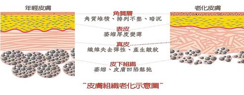 肌膚隨著年齡增長、陽光中的紫外線及各種文明產物的刺激,如氣候條件、輻射等,會導致自由基產生,而出現過量的黑色素顆粒,形成斑點,使膚色變得不均勻、暗沉,再加上自然老化的過程,導致表皮變薄,真皮層中的膠原纖維、玻尿酸等膠狀物質也大幅減少,於是造成皮膚萎縮、皺紋等老化現象的出現。
