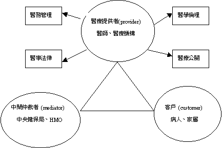 在目前的醫療體制下,醫療提供者(醫師、醫療機構)、病人(客戶、家屬)、媒介仲裁者(中央健保局、 HMO )形成了醫療體系的三角模式。而醫療提供者為了因應醫療的三角關係,必須具備四個面向的基本概念;醫務管理、醫療公關、醫事法律、醫學倫理。